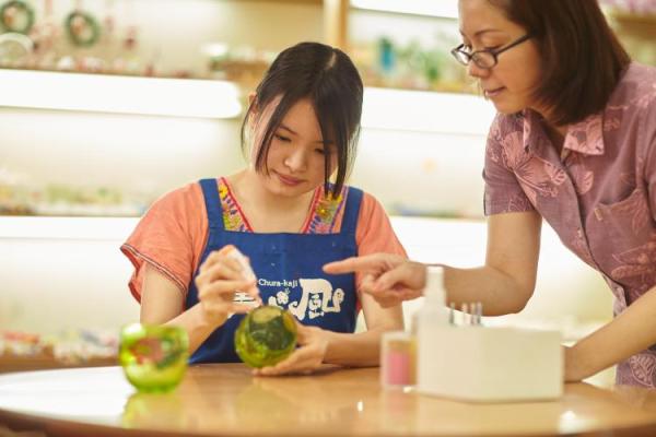 色んな形のグラスや琉球ガラスを使って、自由に絵付け体験!